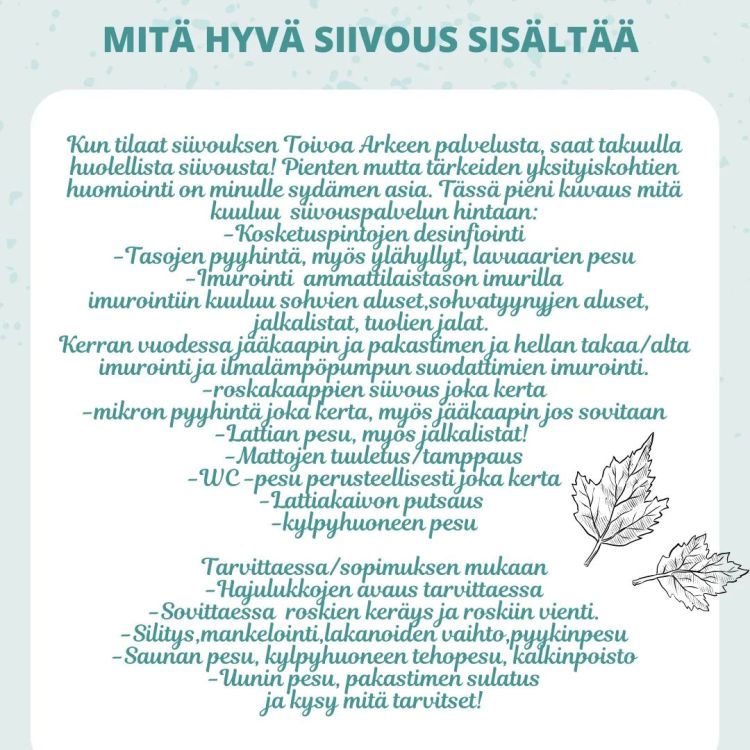 Yrittäjänä tiedän, miten tärkeää on luottamussuhde palveluntarjoajan kanssa ja meille onkin erityisen tärkeää, että asiakkaamme saavat vähintään sen mitä ovat tilanneet. Meiltä saat monipuoliset siivouspalvelut, kysy tarjousta yrityksellesi sähköpostitse osoitteesta toivoaarkeen@gmail.com!